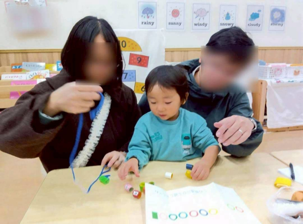 ひも通しの場面では、小さな穴にひもを通そうと、じっと集中する子どもたち。うまく通ると「できた!」と笑顔を見せ、次のビーズも「もういっこ」と意欲的です✨