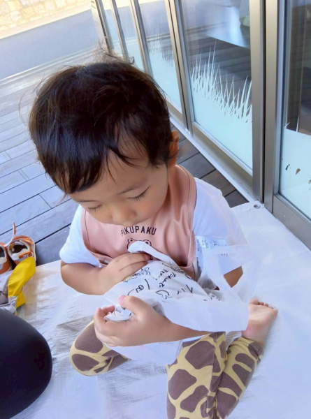 包んでくれた布をやさしく広げると、一気ににっこり😊