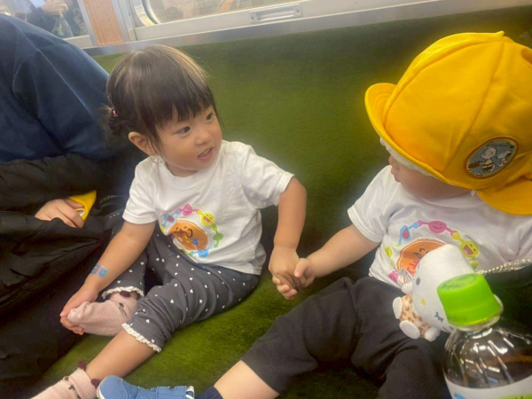 去年の記事では「1,2歳児が電車に乗るって大丈夫なの?」という保護者さまの不安について、園の取り組みをご紹介しました。今年も同じように、出発前には先生と一緒に「静かにしようね」「座っていようね」とお約束しました。
